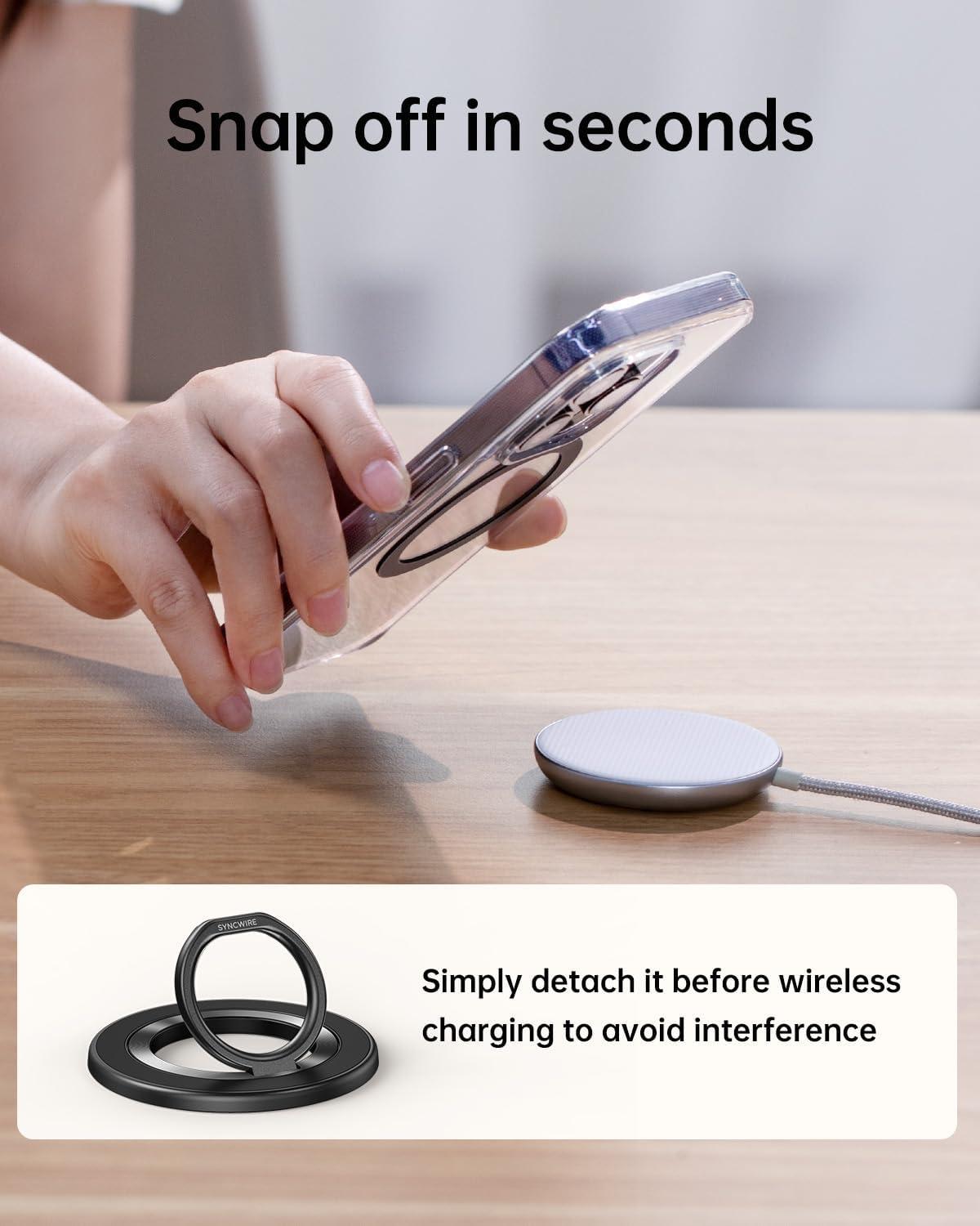 【Super Strong Magnetic】The Syncwire MagSafe phone ring holder is made with N55 NdFeB magnets, providing exceptional magnetic force. You can securely attach your phone to the MagSafe magnetic phone ring holder with just one finger, experiencing a strong hold that resists shaking or movement. The magnetic force can be enhanced by 5 times when used with the provided metal ring.